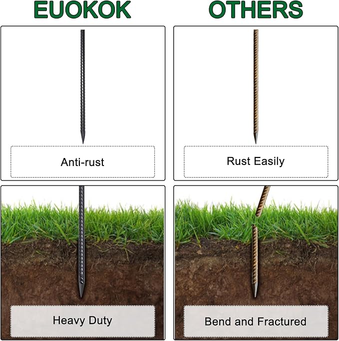 • Heavy Duty Rebar Stakes: These ground spikes heavy duty are malleable steel material and applied black coating, withstanding all types ground and no rusting even in wet soils for years