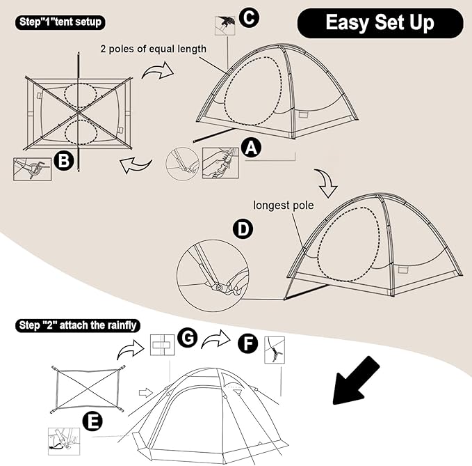 • 【Sturdy & Freestanding】Designed for extreme weather conditions, our 2 man tent boasts sturdy aluminum poles and secure pegs that provide excellent stability. The 3 crossing aluminum poles construction, along with adjustable wind ropes and seam taping, make this backpacking tent capable of standing up to strong winds. Additionally, the freestanding design allows you to easily move and reposition the camping tent without reassembly, making it perfect for versatile campsite setups.