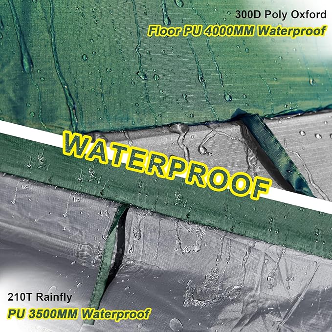 • 【Superior Waterproof Protection】Stay dry and comfortable no matter the weather with our 2 person backpacking tent. Crafted from high-quality materials, the 2 person tent features a 210T rainfly with a PU 3500MM waterproof rating and a 300D Poly Oxford floor with a PU 4000MM waterproof rating. This 4 season tent is fully field tested to withstand heavy rain, ensuring you remain protected from the elements during your camping trips.