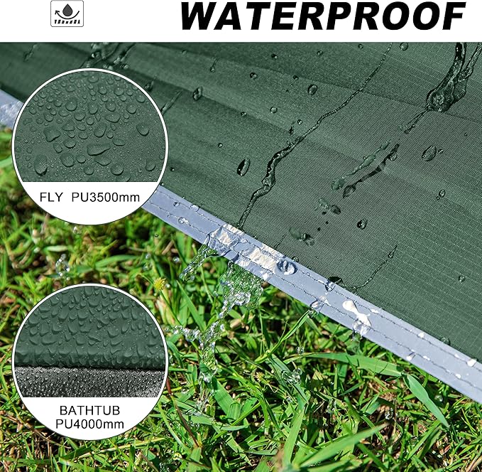 • 【Waterproof Tent】 Crafted from premium 210T rainfly PU 3500MM and a 300D Poly Oxford floor PU 4000MM, this 2 man tent provides outstanding waterproof performance to keep you dry during heavy rain. Enhanced seam taping on all zippers and corners effectively prevents leaks, ensuring a dry and comfortable experience even in challenging weather.