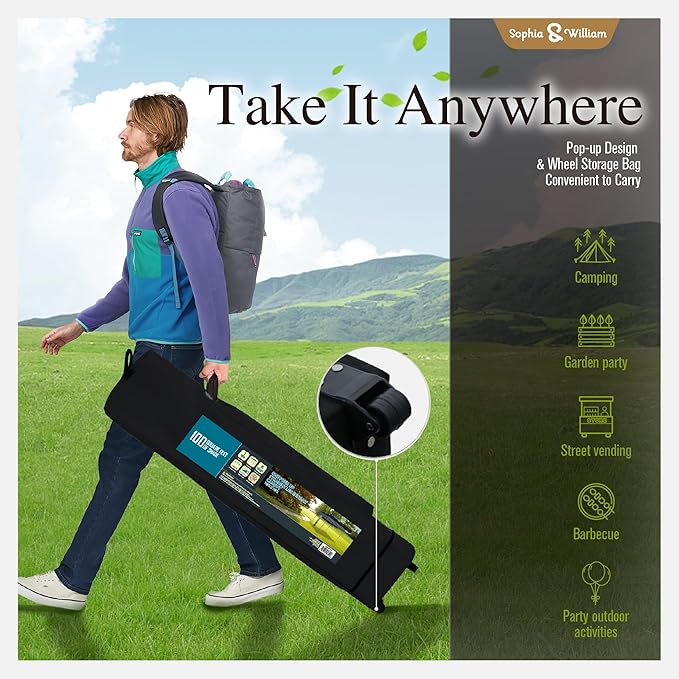 Sophia & William Canopy Tent Pop Up 10x10 ft One Person Push Set Up Tent, Outdoor Canopies Shelter Heavy Duty Straight Legs with 4 Sandbags & Guy Ropes, 1 Roller Bag & Storage Bag, 8 Stakes UPF50+