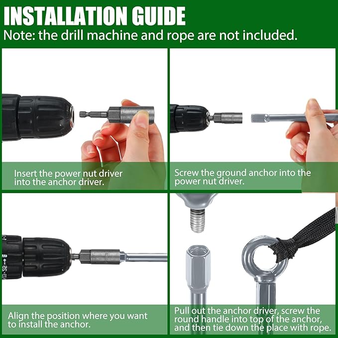 • Easy to Use: the anchors penetrate into hard clay easily with help of drill machine; Just fix the anchor on the drill machine, and mark an insertion point, then press the button and the anchor will quickly drill into the ground, keeping the ground wet before starting the job makes it easier to penetrate the soil. Tips: Not suitable for soil with hard rocks or heavy roots, as this may cause damage to the anchor or overload of the cordless drill