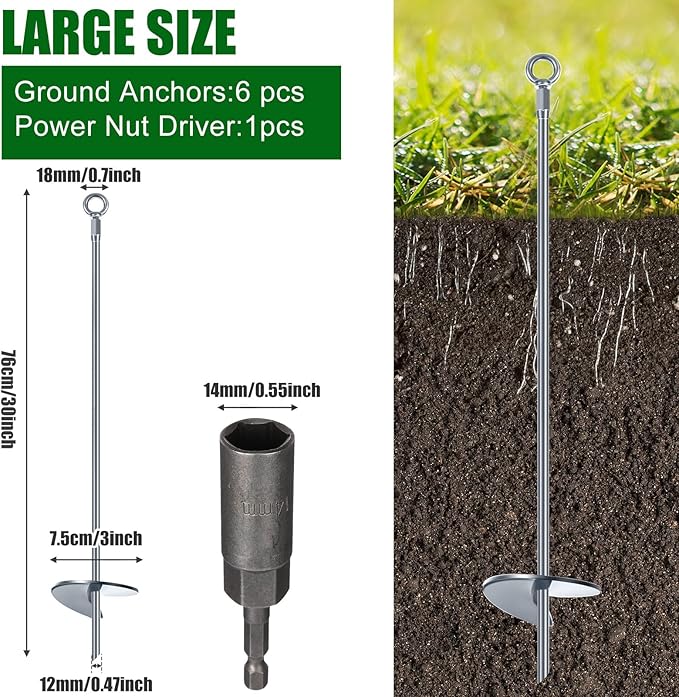 • Large Size: the ground anchor measures about 0.47 inches/ 12 mm diameter, about 30 inches/ 76 cm tall, with about 3 inches/ 7.5 cm wide helix and about 14 mm/ 0.55 inch drill a bit of diameter; The ground augers can insert deeper into the ground for better wind resistance, have various uses and can tie down to the ground structures