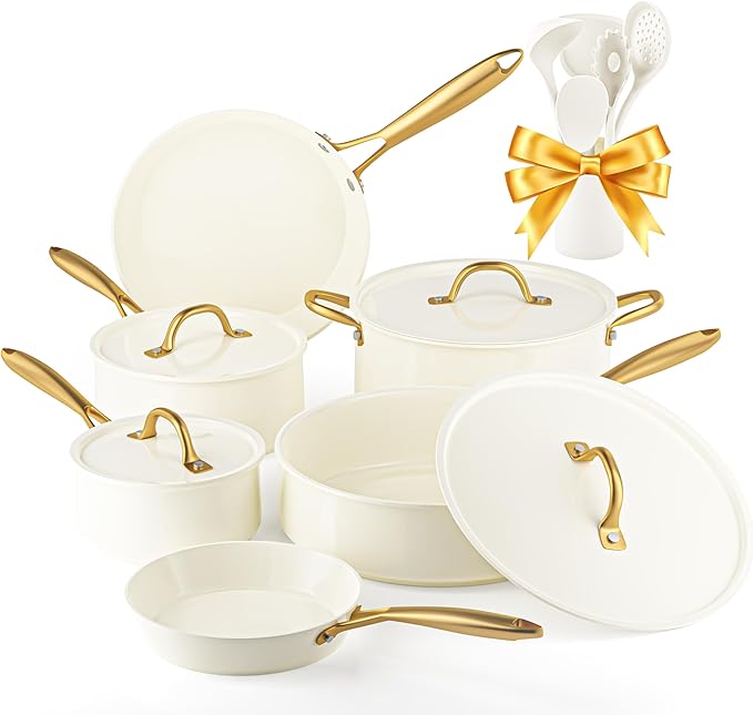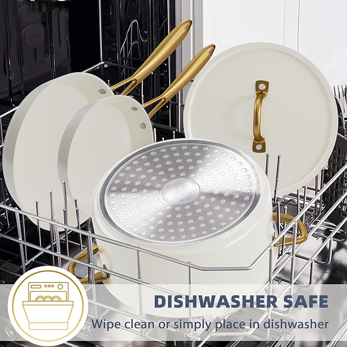 • NATURALLY NONSTICK: No more sticky or difficult-to-clean problems. The ceramic cookware set requires less oil or butter for cooking and minimal scrubbing for a spotlessly clean.