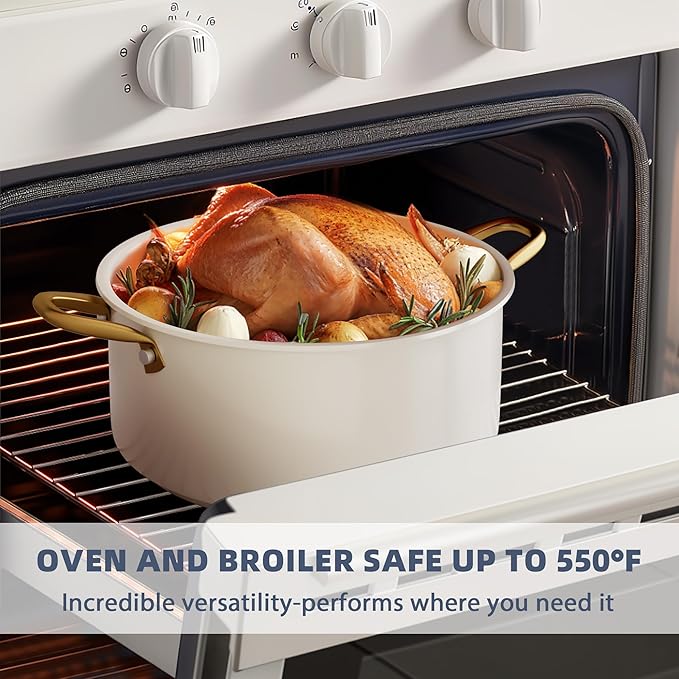 • FOR ALL STOVETOP & OVEN SAFE: The innovative induction base delivers uniform heat distribution on all cooktops, induction, gas, electric, halogen or ceramic. Plus, oven safe up to 550°F, making the non stick pots and pan set great for bread baking and roasts.