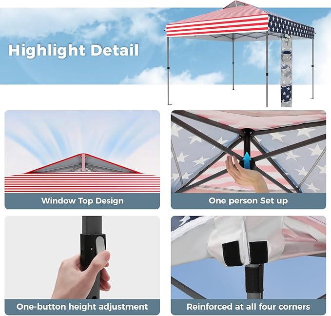 GREEN PARTY 10x10 ft Pop Up Canopy Tent, 1-Person Setup Instant Outdoor Canopy with Vented Top, Wheeled Carry Bag, 4 Ropes & 4 Sandbag -American Flag