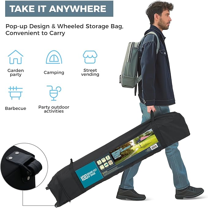• EXTRA LARGE AREA: This straight leg 10x10 canopy can provide 100 square feet of shade area, enough to accommodate 6-8 people. and height can be adjusted in 3 levels. It is very suitable for commercial, camping, festivals, tailgates, backyard activities, etc.