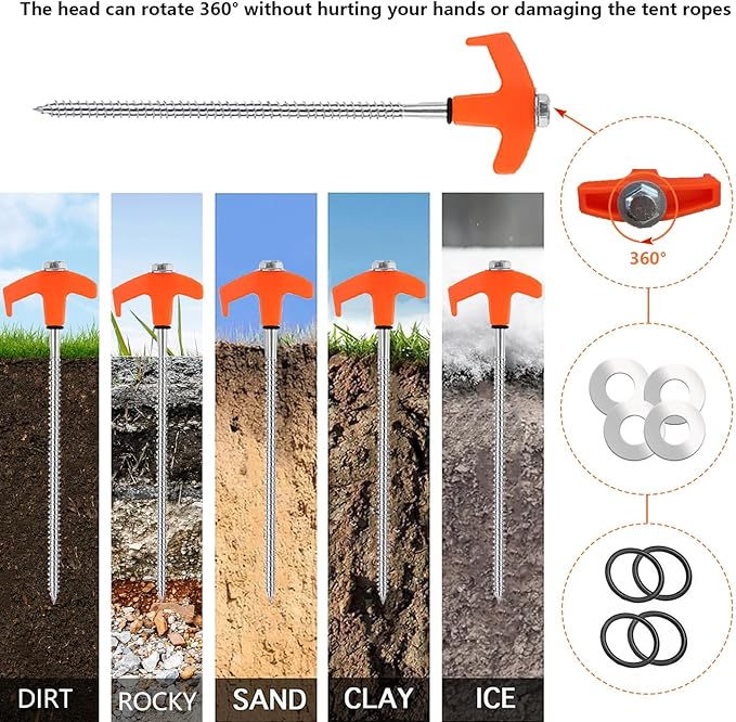 • 【Simple Installation】These screw in stakes with pointed tips is easy to insert into the grass, dirt, hard soil, and gravel. The metal threaded tent spikes offer a stronger grip in windy conditions. With the help of a cordless drill or impact driver, ground anchors will make your tents, canopy, awning, tarps, and grasp the ground more stable and reliable.
