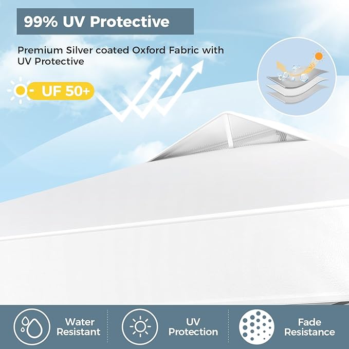 • UPF 50+ PROTECTION & VENTED TOP DESIGN: Outdoor canopies top are made of high-quality and durable 150D silver-coated oxford fabrics, which can block 99% of UV rays and are waterproof. Unique vented top design can promote the flow of air inside and outside the canopy, making you cooler and more comfortable in hot summer. At the same time,improves the stability of the entire canopy.