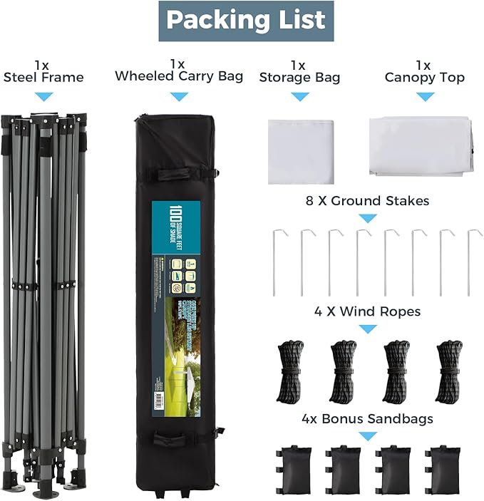 • PACKAGE LIST: 1x canopy frame + 1x canopy top + 1x wheeled bag + 4x wind ropes +8x ground stakes. Note: During strong winds or heavy rain, be sure to retract the canopy to avoid damage. If you have any questions about the product, please feel free to contact us, we will help you within 24 hours.