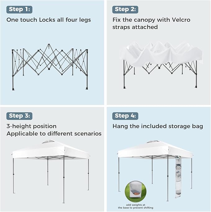 • STURDY & STABLE FRAME STRUCTURE: Pop up canopy frame is made of high-strength steel and alloy material, durable and anti-corrosion. the stress points at the junction of the top rods are reinforced, making it longer service life. Straight legs design, 3 levels of height adjustment, and an improved toggle leg adjustment device make it easier to install and adjust the canopy.