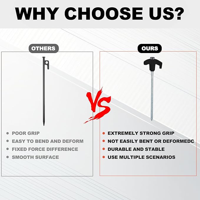 • Versatile usage:Whether you want to secure your tent, awning, billboard, shelter, gazebo, or even secure your pet leash, Christmas decorations, New Year's decorations, landscape trim, or outdoor decoration the canopy stakes can help you out.