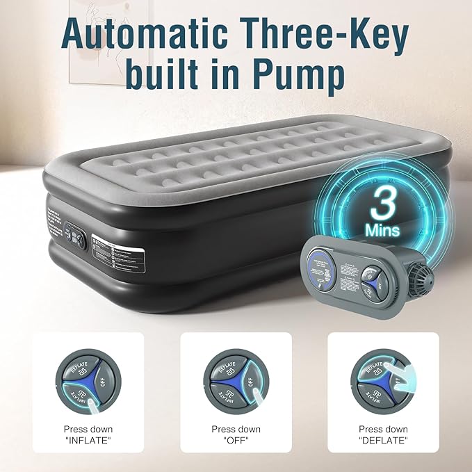 • Built In Pump: Three-Key built in pump allows you to operate with less effort when in- or deflating, and the full degree of inflation can be adjusted according to everyone's sleeping habits. The built-in 110V high power electric air pump has independent inflating, deflating and pause buttons, which can be quietly in- or deflated within 3 minutes with the press of buttom (Tips: This pump of twin air mattress doesn't support automatic stop of filling, you need to manually stop in- or deflation.)