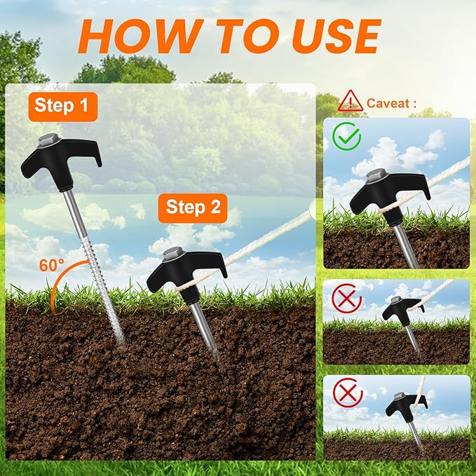 • Convenient and Practical: Our tent stakes have pointed tips that are easy to insert into hard soil, and the spiral design offers a stronger grip; With the help of a cordless drill or impact driver, these stakes will have your tents, canopy, awning or tarps grasp the ground more stable