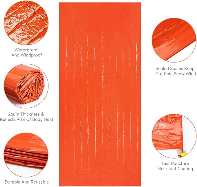 • Ultra-bright Reflective Surface: Trapped in the dark? Let this Survival Blanket Bag light the way. The bright orange emergency sleeping bag and its reflective surface will provide crucial visibility and help first res-ponders find you.