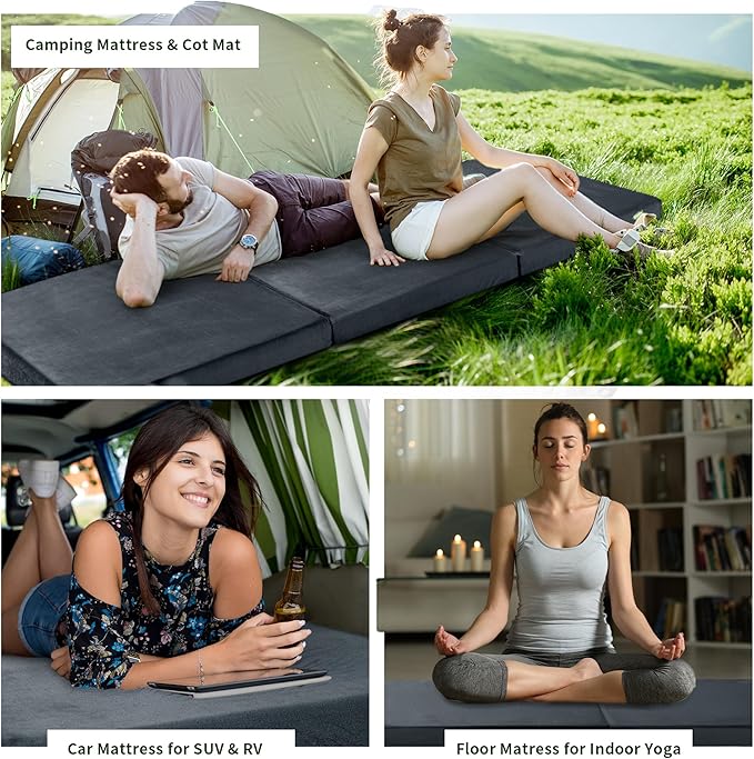 • 【Tri-Fold with Matching Carry Bag】 Our versatile folding bed unfolds to a spacious Single Mattress 72"L x 24"W x 3"H, then conveniently folds to 24”L x 24”W x 9”H, serving as an ideal fold-out camping bed. Use it fully open, as a folding sofa bed, or fold it for easy closet storage when not in use. Lightweight and easy to carry, space-saving, perfect for any outdoor activities, such as family travel or car camping.