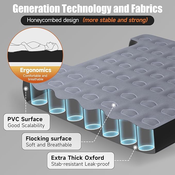 • Multi-Layer Air Column Design : Constructed with a unique multi-layer air column structure, say no leakage, this inflatable truck bed air mattress provides superior support and stability, allowing for a comfortable sleeping experience even on uneven surfaces.