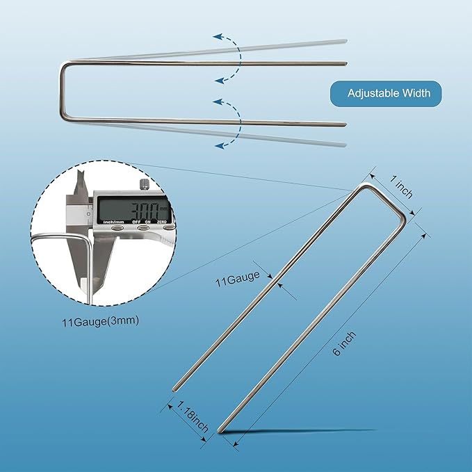 • 【LANDSCAPE STAPLES PACK】100 pack U-shaped lawn stakes with beveled ending are 11 gauge, 6 inches length, 1 inch adjustable width