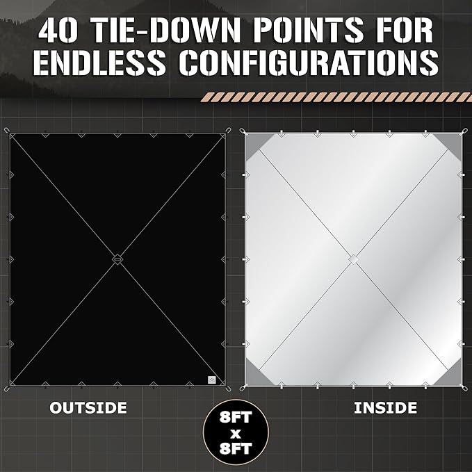 • VERSATILE SETUP OPTIONS - Whether you need a hammock tarp, rain fly, or ground cover, this multi-purpose tarp features 40x reinforced attachment points, allowing for a customizable setup during backpacking, camping, or survival situations.