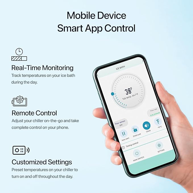 • Fast-Cooling Ice Bath Chiller – Our powerful 1/3HP cold plunge tub chiller rapidly drops water temperature to 37°F. A top-tier water chiller for cold plunge recovery, post-workout cool downs, or daily wellness routines.