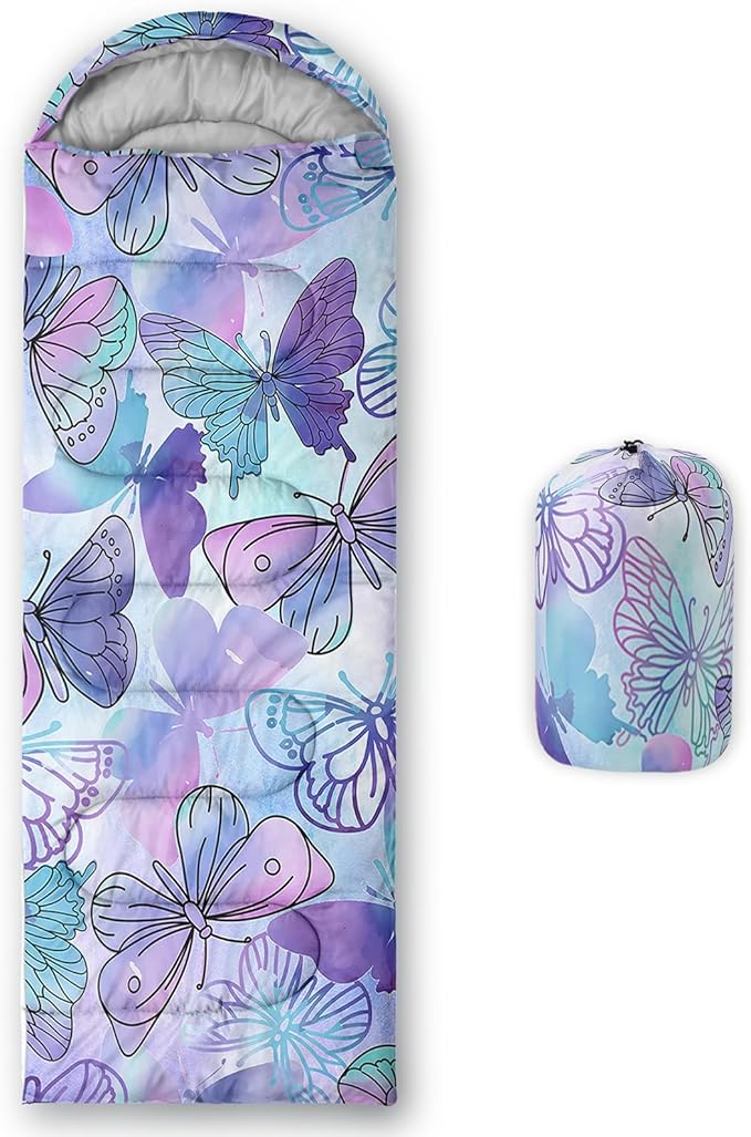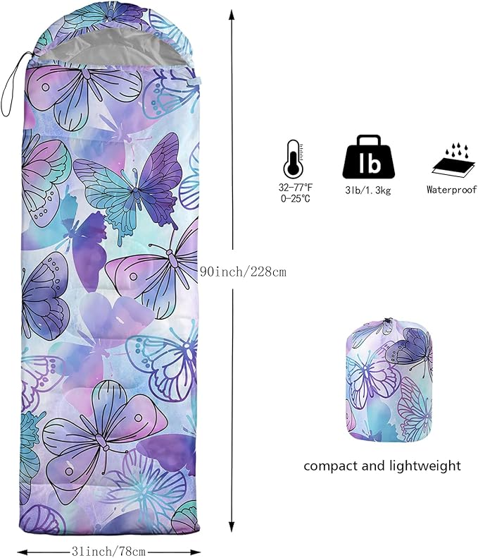 • Applicable For 3 Seasons: Our purple butterflies sleeping bag can be used temperatures ranging from 32°F-77°F Except for the cold winter,sleeping bag have weatherproof to prevent from dampness,Size is 31 x 90 inches