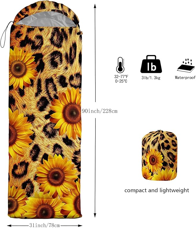 • 【Fits For 3 Seasons】: Size - 31 by 90 inches (W x D). Our Leopard Print sleeping bag can be used in 3 seasons with a design temperature of 32℉-77℉(0℃-25℃)
