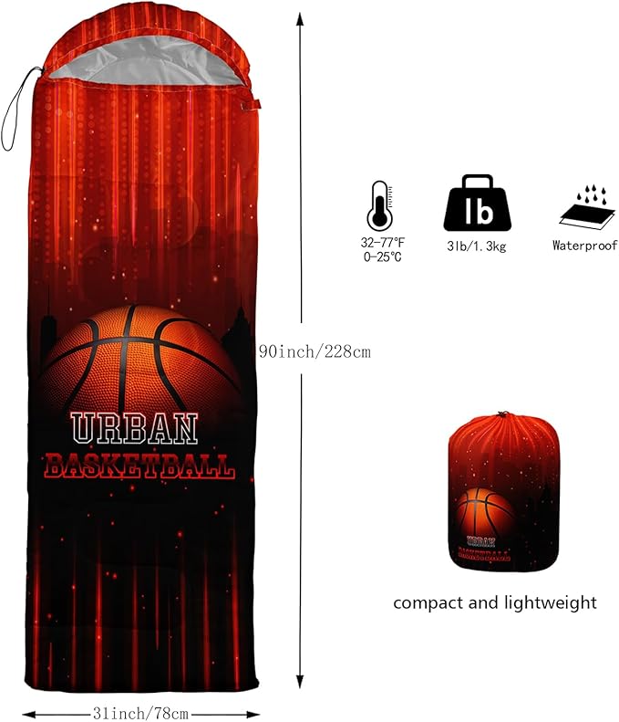 • Applicable For 3 Seasons: Our basketball sleeping bag can be used temperatures ranging from 32°F-77°F Except for the cold winter,sleeping bag have weatherproof to prevent from dampness,Size is 31 x 90 inches