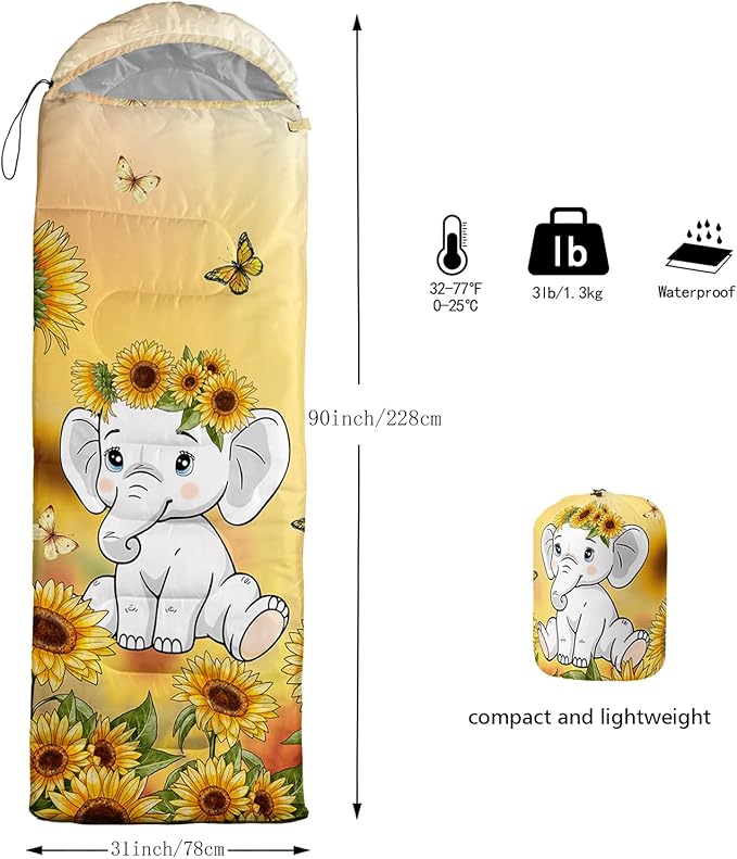 • Applicable For 3 Seasons: Our cartoon elephants sleeping bag can be used temperatures ranging from 32°F-77°F Except for the cold winter,sleeping bag have weatherproof to prevent from dampness,Size is 31 x 90 inches