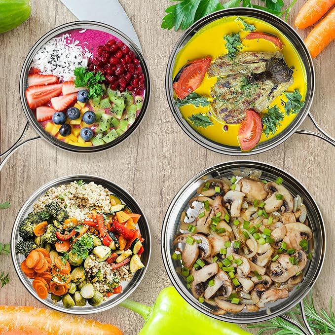 18/8 Stainless Steel Camping Cook Pot Set of 4 pcs, Camping Messware Kit, Camping Cooking Set, Backpacking Camping Cookware, Picnic Camping Cooking Mess Kit