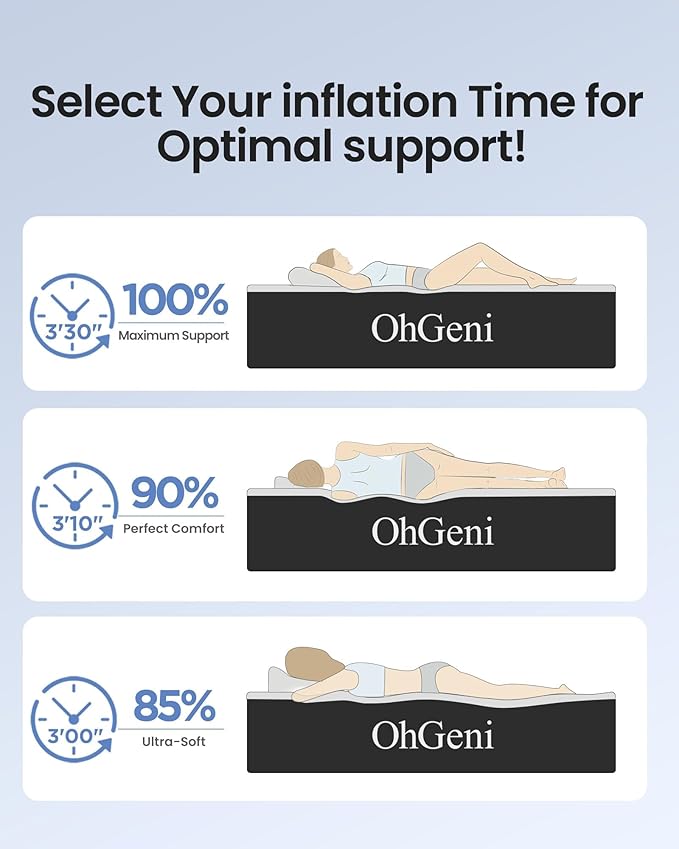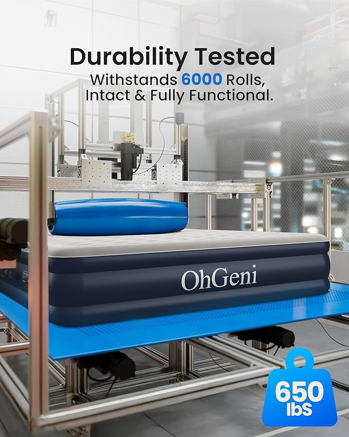 • Unrivaled Comfort: Experience unmatched comfort on the OhGeni air mattress/colchon iinflatable, a meticulously designed 18" deep queen size inflatable bed (80"L x 60"W x 18"Th) with a built-in 110V electric air pump for quick and effortless full-body support. The air coil support system provides even and secure weight distribution from head to toe, ensuring maximum relaxation for adults and durability for the whole family