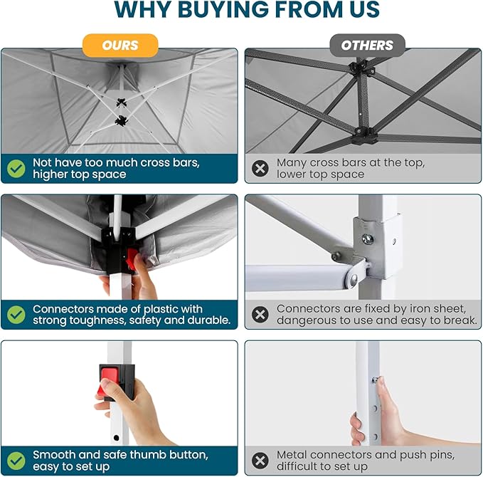 • Easy Setup and Storage:Adjustable to three heights—114 inches, 118 inches, and 122 inches—10 x 10 pop up canopy tent can be set up by 1-2 people without tools. Detailed installation videos and instructions are provided. Contact us if you encounter any issues during setup.