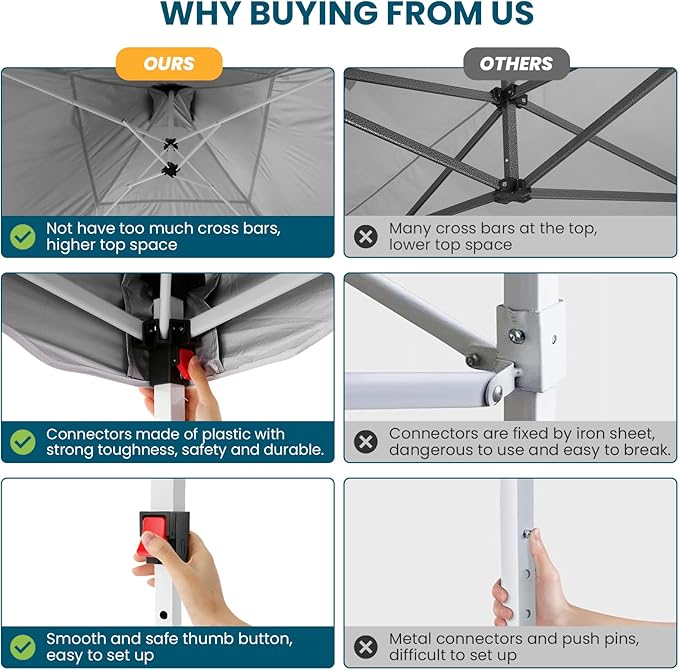 • Easy Setup and Storage:Adjustable to three heights—114 inches, 118 inches, and 122 inches—10 x 10 pop up canopy tent can be set up by 1-2 people without tools. Detailed installation videos and instructions are provided. Contact us if you encounter any issues during setup.
