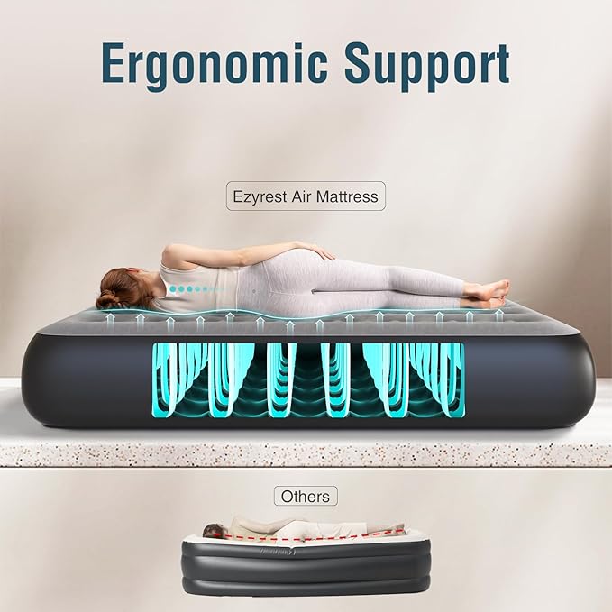 • Outstanding Safety and Comfort: Ezyrest air mattress 13" are made from an upgraded PVC material formula for better abrasion resistance and ductility. The unique Ring Inflatable Structure provides stability, reduces noise and prevents tipping or slipping. This supports our body and protects our spine when we lie down, and make sure for your ideal comfort