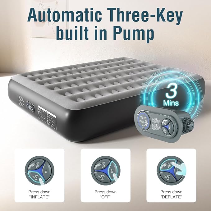 • Built In Pump: Three-Key built in pump allows you to operate with less effort when in- or deflating, and the full degree of inflation can be adjusted according to your sleeping habits. The built-in 110V high power electric air pump has independent inflating, deflating and pause buttons, which can be quietly in- or deflated within 3 minutes with the press of the button (Tips: This pump of inflatable air bed does not support automatic stop of filling, you need to manually stop in- or deflation.)