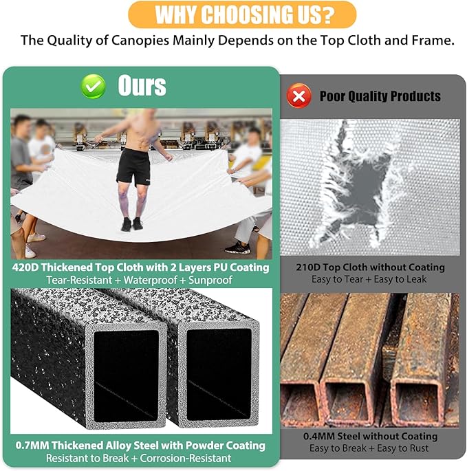 • 【420D PU Oxford Cloth】Heavy duty canopy tent 10x30 is made of 420D Oxford cloth with two layers of PU coating, UPF 50+, which blocks 99% of UV rays. Waterproof canopy gazebo tent with waterproof strip adopts heat-sealed seam technology, 100% waterproof, 1500mm waterproof pressure. Wedding tent professionally protects you from sun, wind and rain. Tents for parties is perfect for playground, yard, beaches, farm, gym, barbecu, trade shows, sporting event, disaster relief or other outdoor events.