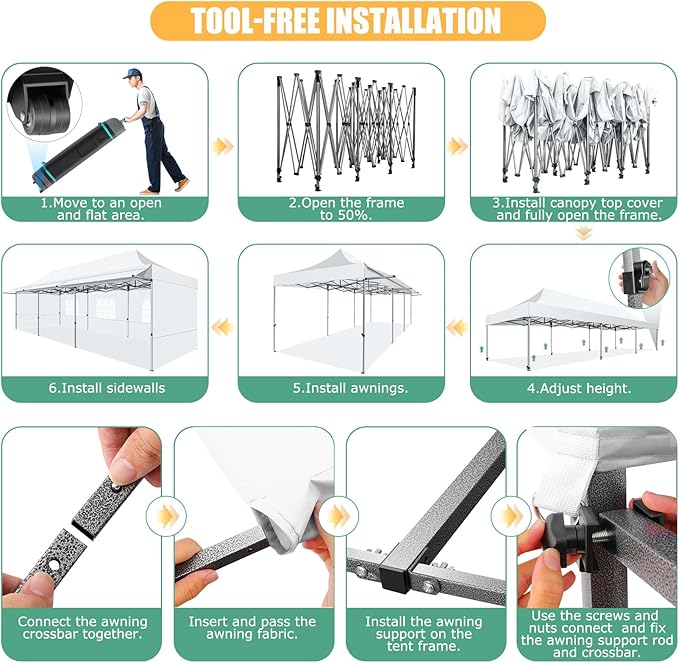 • 【Heavy Duty Alloy Steel Frame】The upgraded 10x30 commercial pop up canopy tent frame can hold up to 220 lbs (100 kg) on a single pole. The frame can hang 8 adults at the same time! Can withstand 4 winds.(<18 mph). 10x30 party tent with an upgraded alloy steel full truss structure, and reinforced plastic parts at the stress points at the intersection of the peaks and poles. 10x30 heavy duty canopy frame with powder coated coating guarantees rust resistance and corrosion resistance.