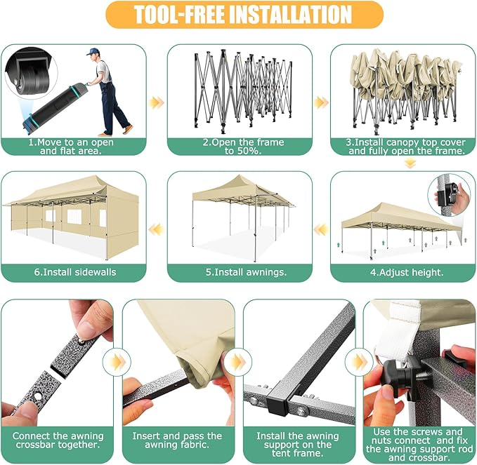 • 【3 Height Settings】10x30 pop up party tent straight leg has 3 height settings. Thumb latch lock system easy to lock and release, raise the pop up tent to a desired height. Canopy tent 10x30 straight leg height options: 214cm/84.3inch,223cm/87.8inch,232cm/91.3inch. Corresponding party tent center height options: 310cm/122.1inch, 319cm/125.6inch, 328cm/129.1inch. 10x30 canopy with sidewalls perfect for commercial activities, camping, festivals, tailgating, backyard events and etc.