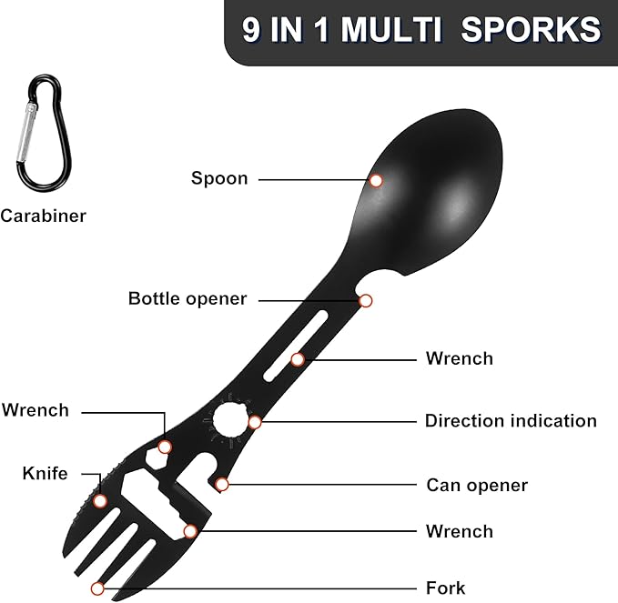 • Multi-functional Camping Sporks - Made of stainless steel, it can be a spoon, fork, bottle opener, can opener, or positioning wrench which will add more functions to your camping travel and feature a hole to attach it to a backpack with a keychain for portability