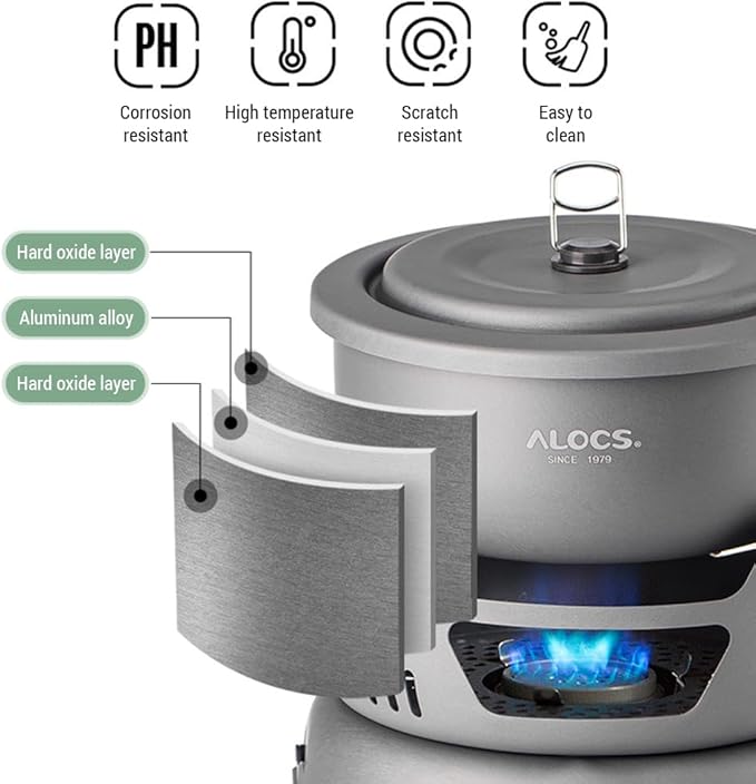 • Crafted from ultra-lightweight, durable hard alumina, stainless steel, and copper, this camping cookware set stands up to high heat, resists scratches, and fights oxidation for long-lasting performance.