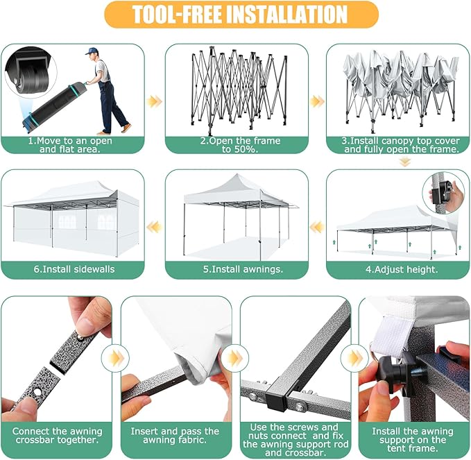 • 【Removable Awning】20% More Shade by the Awning. The 4 side walls with PU coating are connected to the top of the frame and the legs by a whole piece of touch fastener for fixing, and are detachable, you 10 x 20 canopy tent heavy duty can install any number of side walls. When in use, always secure the 10x20 pop up tent with the included stakes and ropes to avoid damage. One year after-sale protection for canopy frame; Six months after-sale protection for fabrics and accessories.