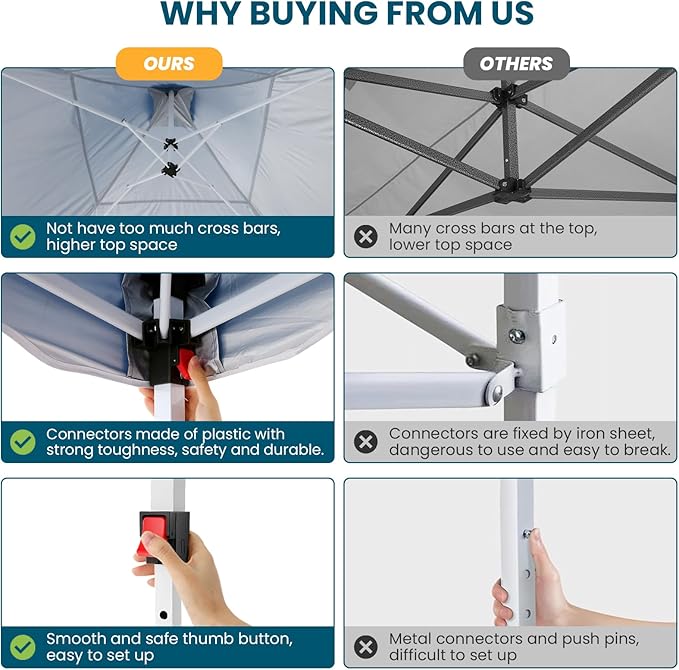 • Easy Setup and Storage: Adjustable to three heights—114 inches, 118 inches, and 122 inches—10 x 10 pop up canopy tent can be set up by 1-2 people without tools. Detailed installation videos and instructions are provided. Contact us if you encounter any issues during setup.