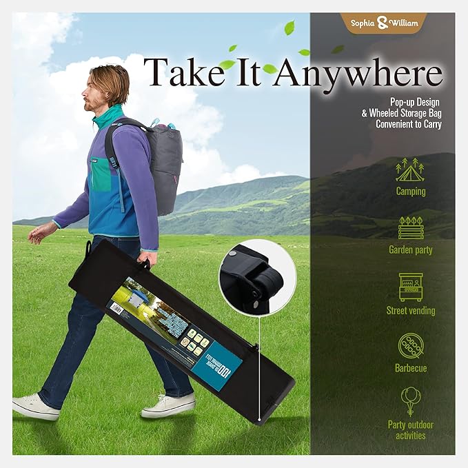 • Packing List: 1 pre-assembled steel frame + 1 canopy top + 1 roller bag + 8 steel stakes + 4 guy ropes+4 sandbags+1 storage bag and a installation manual. A free roller bag makes it convenient for you to take the canopy tent anywhere: as a moving selling stall, going to the beach, or having outdoor parties and barbecues