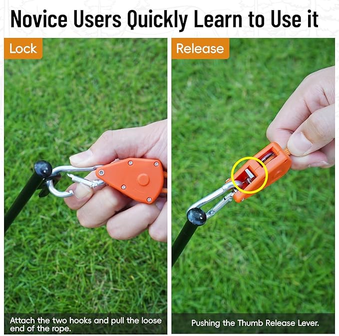 • 3. Easy Lock and Release:Simply attach the hooks, pull the rope tight, and the system automatically locks in place. Releasing is just as easy—press the Thumb Release Lever for a smooth, hassle-free disengagement