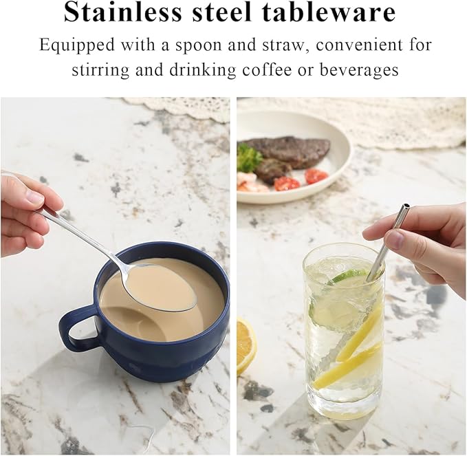 • Portable Travel Cutlery Set Includes: 1 blue plates, 1 blue coffee mug, 1 straight straw, and 1 set of stainless steel cutlery, the cutlery includes knive, fork, spoon and chopsticks. You will receive a beautifully complete set!