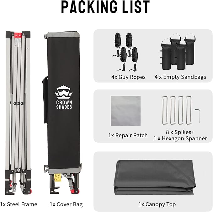 • SPACIOUS AND COMPACT - With a 10' x 10' canopy footprint, this tent provides 100 square feet of shade, accommodating up to 10 people comfortably. The interior height exceeds 9 feet, and the maximum clearance under the valance is over 6 feet. When packed, the dimensions are 45” x 8.5” x 8.5”, fitting perfectly in your vehicle’s trunk. The headroom is enhanced by the absence of overhead crossbars, offering more spaciousness compared to traditional designs, making it great for parties and events