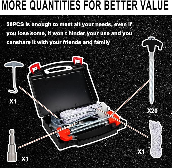 • ACCESSORIES: easy to store and sturdy carrying case, 13mm hex bit, tent stakes nail puller, 50FT tent rope.