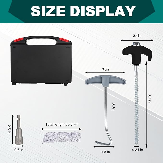 • ACCESSORIES: easy to store and sturdy carrying case, 13mm hex bit, tent stakes nail puller, 50FT tent rope.