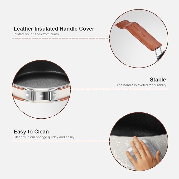 • High Quality Pot And Pan - Made from premium aluminum alloy, the pot and pan ensure even heat distribution and easy cleaning. The leather handle cover provides a comfortable, high-temperature resistant, and safe grip.