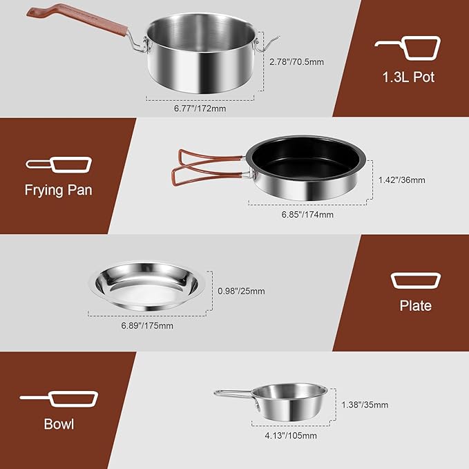 • Complete Camping Cookware Set - The 10pcs set includes 1 x 1.3L pot, 1 x frying pan, 1 x plate, 1 x stainless steel bowl, 1 x leather-insulated handle cover, 1 x mesh storage bag, stainless steel cutlery set (1 x knife, 1 x fork, 1 x spoon) and 1 x cleaning sponge to meet all your outdoor cooking needs.