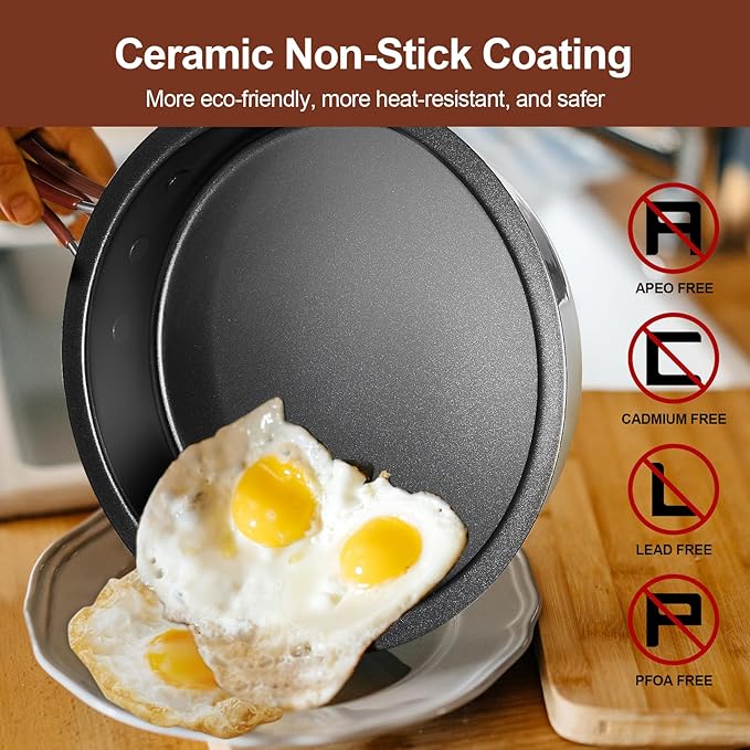 • Ceramic Non-Stick Coating - The frying pan in this cookware set features a ceramic non-stick coating that is safe and non-toxic, ensuring no more burnt food. Please read the included product care card carefully before use.
